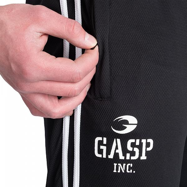 Features: zippers at pocket, breathable mesh fabric, stripes along outside of legs, print below pocket, drawstring for adjustable waist